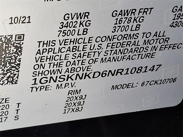 10-Way Power Driver & Passenger Seat 1st & 2nd Row Color-Keyed Carpeted Floor Mats, 2-Speed Active Electronic AutoTrac Transfer Case, 2nd Row Pwr Release 60/40 Split-Folding Bench Seat, 3.23 Rear Axle Ratio, 3rd Row 60/40 Power-Folding Split-Bench Seat, 3rd row seats: split-bench, 4-Wheel Disc Brakes, 9 Speakers, ABS brakes, Advanced Trailering Package, Air Conditioning, Alloy wheels, AM/FM radio: SiriusXM with 360L, Apple CarPlay/Android Auto, Auto High-beam Headlights, Auto-Dimming Inside Rear-View Mirror, Automatic Stop/Start, Automatic temperature control, Bose 9-Speaker Stereo Audio System Feature, Brake assist, Bright Front & Rear Door Sill Plates, Bumpers: body-color, Compass, Delay-off headlights, Driver & Front Outboard Passenger Airbags, Driver Alert Package, Driver door bin, Driver vanity mirror, Dual front impact airbags, Dual front side impact airbags, Dual-Pane Power Panoramic Sunroof, Electronic Stability Control, Emergency communication system: OnStar and Chevrolet connected services capable, Enhanced Driver Information Center, Floor Console w/Storage Area, , Front anti-roll bar, Front Bucket Seats, Front dual zone A/C, Front High-Back Reclining Bucket Seats, Front reading lights, Fully automatic headlights, Garage door transmitter, Hands-Free Rear Power Programmable Liftgate, HD Surround Vision, Heated 2nd Row Outboard Seats, Heated door mirrors, Heated Driver & Front Passenger Seats, Heated front seats, Heated Steering Wheel, Hitch Guidance w/Hitch View, Illuminated entry, Infotainment Display, Integrated Trailer Brake Controller, Lane Change Alert w/Side Blind Zone Alert, Leather steering wheel, Leather-Appointed Seat Trim, Leather-Wrapped Steering Wheel, LED Daytime Running Lamps, Low tire pressure warning, LT Signature Package, Luxury Package, Max Trailering Package, Memory seat, Memory Settings, Memory Settings for Driver, Navigation System, Not Equipped w/Steering Column Lock, Occupant sensing airbag, Outside Heated Power-Adjustable Mirrors, Outside temperature display, Overhead airbag, Overhead console, Panic alarm, Passenger door bin, Passenger vanity mirror, Power door mirrors, Power driver seat, Power Liftgate, Power passenger seat, Power Release 2nd Row Bucket Seats, Power steering, Power Tilt & Telescopic Steering Column, Power windows, Preferred Equipment Group 1LT, Premium audio system: Chevrolet Infotainment System 3, Premium Smooth Ride Suspension, Radio: Chevrolet Infotainment 3 Premium System, Rain sensing wipers, Rear air conditioning, Rear anti-roll bar, Rear Cross Traffic Alert, Rear Pedestrian Alert, Rear reading lights, Rear seat center armrest, Rear Seat Media System (DISC), Rear window defroster, Rear window wiper, Remote keyless entry, Remote Start, Security system, SiriusXM Radio w/360L, Smar